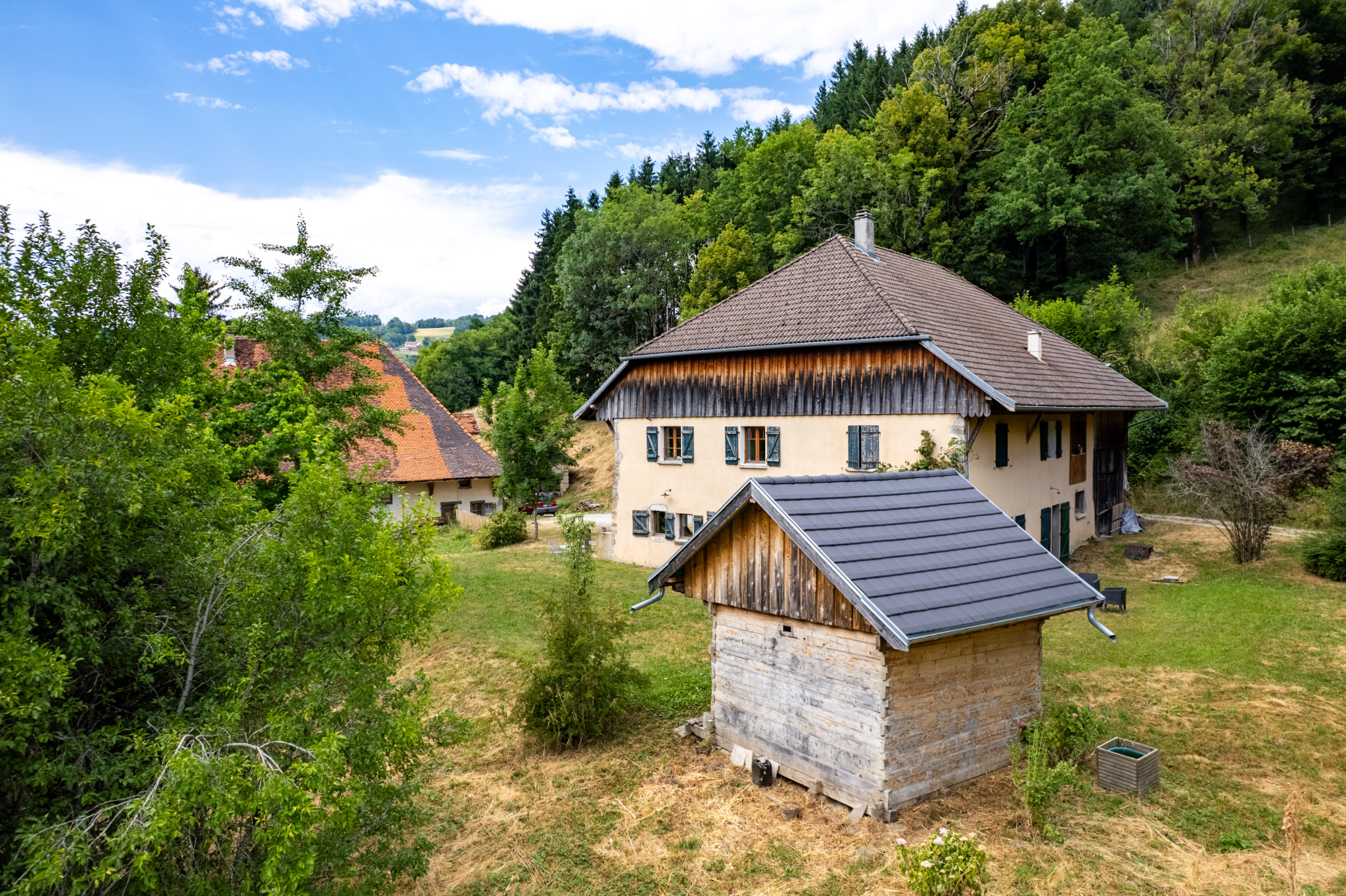 À l’extérieur, vous profiterez d’un très grand jardin offrant intimité et ensoleillement, idéal pour des moments de détente en pleine nature. La propriété comprend également un mazot ancien rénové, une grange, ainsi qu’un espace de stationnement.